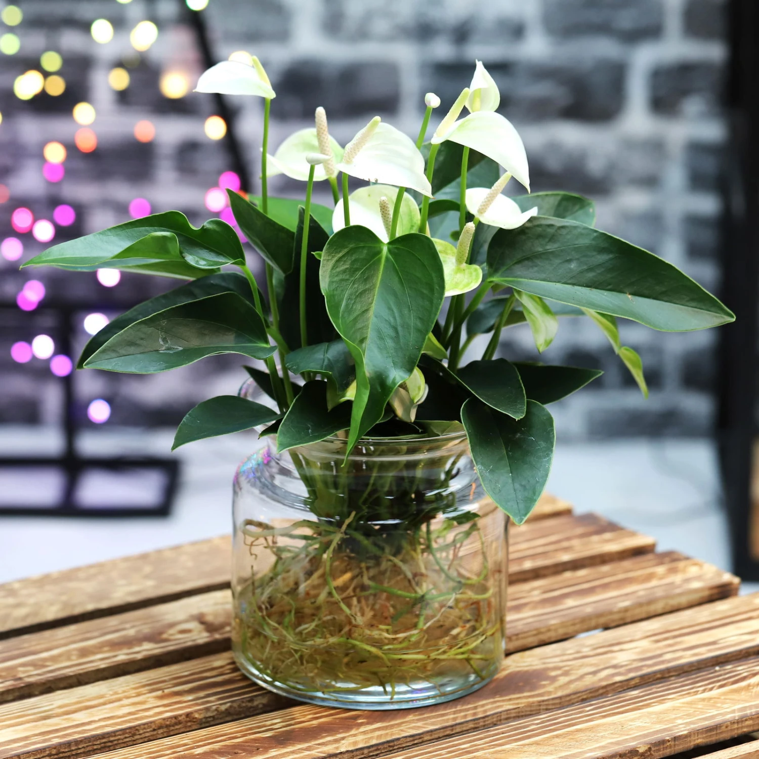 Mit dieser exklusiven Pflanzenschönheit holen Sie sich einen ganz besonderen Eyecatcher nach Hause: Diese exotische Flamingoblume, botanisch Anthurium genannt, kommt ganz ohne Erde aus und gedeiht ausschließlich in Wasser. In Kombination mit den weißen, lackartigen Hüllblättern der Blüten und den glänzenden, lanzettlichen Blättern ziehen die freigelegten Wurzeln in der modernen Glasvase alle Blicke auf sich! Aber auch als Geschenk ist diese Rarität für jeden Zimmergärtner eine schöne Idee.