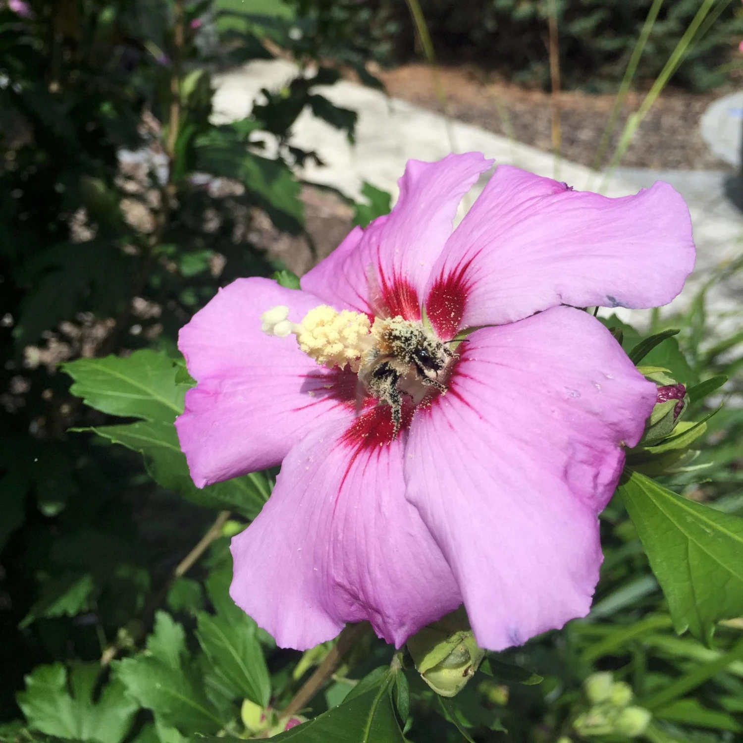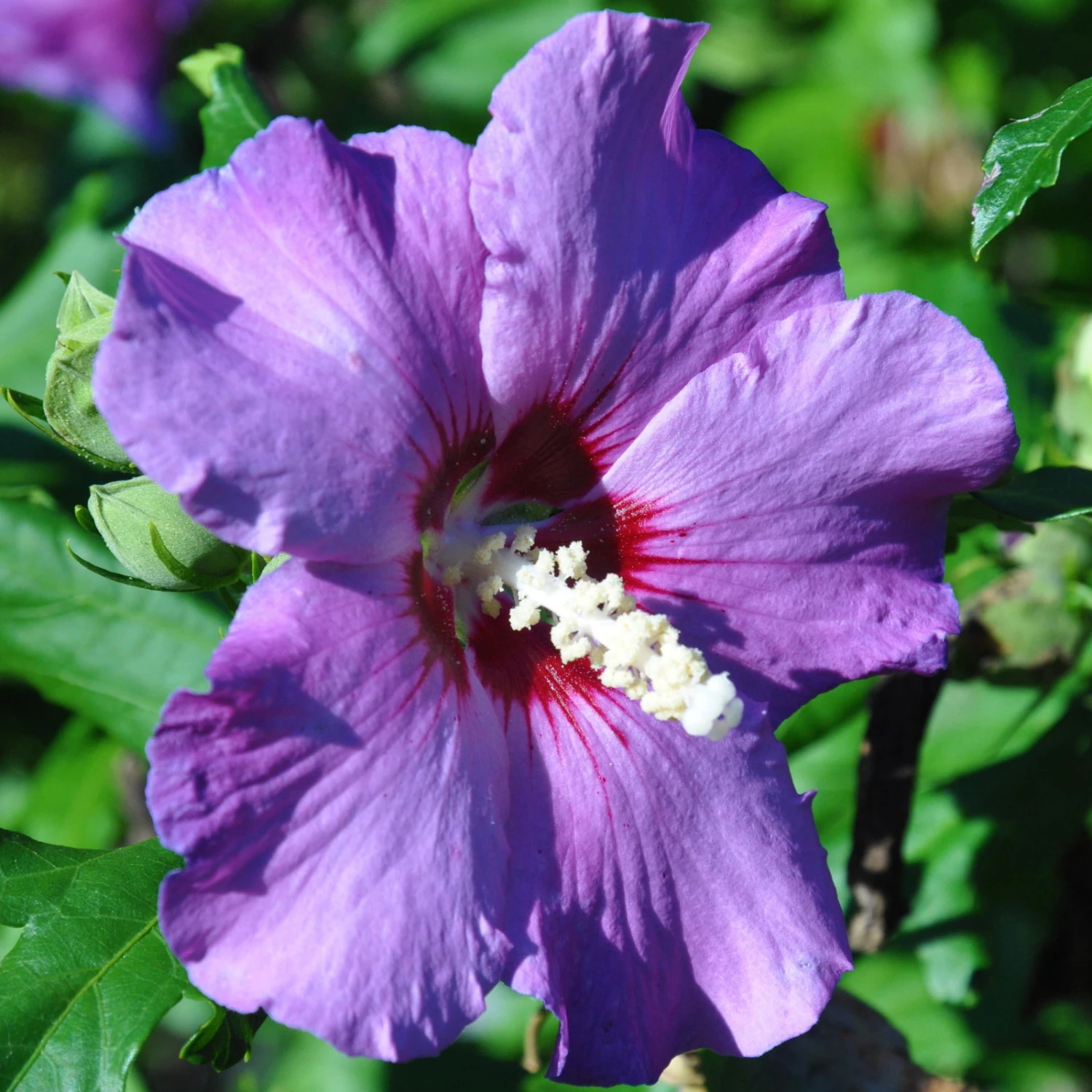 Der Garten-Hibiskus gehört zu den bekanntesten und beliebtesten Sommerblühern für den Garten. Die exotische Blütenform und die lange Blütezeit des winterharten Strauchs erfreuen Sie jedes Jahr. Die Sorte `Russian Violett®‘ zeichnet sich durch farbenprächtige violette Blüten mit roter Mitte aus. Die pollenreichen Blüten sind im Sommer eine willkommene Nahrungsquelle für viele Hummeln und Bienen. Die Sorte ‚Russian Violet®‘ ist ein langsam wachsender, sommerblühender Strauch, der eine Wuchshöhe bis 2 m erreicht. Der Hibiscus syriacus blüht wetterabhängig zwischen Juli und September und fühlt sich an einem sonnigen Standort am wohlsten. Auf Trockenheit reagiert der Garten-Hibiskus empfindlich mit Knospenabwurf, Staunässe aber unbedingt vermeiden. Im Frühling sollten Sie den Garten-Hibiskus ‚Russian Violet®‘ leicht zurückschneiden, um den Hibiskus in die gewünschte Form zu bringen und den Neuaustrieb und damit die Blütenpracht im Sommer zu fördern.
