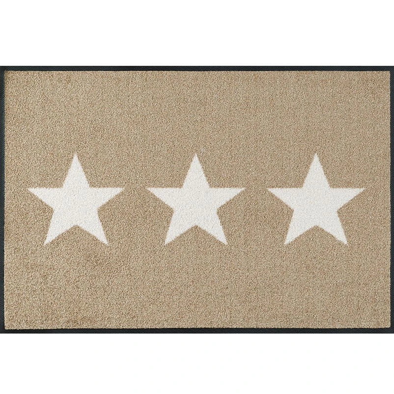 Hergestellt in Europa, besteht die sandfarbene Fußmatte „Stars“ aus besonders schmutzempfänglichem Polyamid sowie einem rutschhemmenden Rücken aus Nitrilgummi. Sie eignet sich zum Einsatz auf allen glatten, unebenen oder beheizten Fußböden und passt dank des dichten und überaus flachen Flores unter beinahe jede Türe.