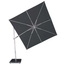 Mit dem quadratischen Pendelschirm von Knirps erstehen Sie den perfekten Sonnenschirm für Ihren Garten oder die Terrasse. Das Schirmdach misst ca. 275 x 275 cm und bietet so besonders viel Schatten. Dieser Schirm steht für die innovative Verbindung von Nützlichem mit Schönem: Ein schmückendes Design-Element, das Sie vor der Sonne schützt. Der wuchtige Mast aus witterungsbeständigen Aluminium in Grau und der massive Sockelfuß in dezenter Optik verleihen dem Sonnenschirm eine zeitlose Erscheinung. Der Ampelschirm lässt sich durch den Schiebegriff und die leichtgängige Kurbel einfach und ohne großen Kraftaufwand aufspannen. Aufgrund des Drehtellers mit Fußtaster ist der Sonnenschirm um 360° drehbar und lässt sich mühelos durch einfache Schrägstellung schwenken. Somit passen Sie das Schirmdach ganz einfach an den jeweiligen Sonnenstand an. Der Bezug besteht aus witterungsbeständigem Polyesterstoff, ist fleckschutzimprägniert, wasserabweisend, UV-beständig, abnehmbar und per Handwäsche waschbar.