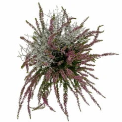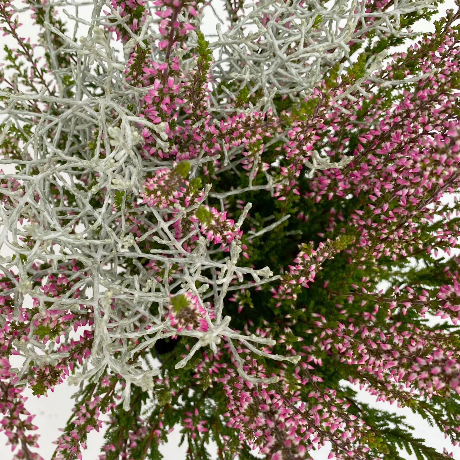 Das Duo Knospenheide (Calluna vulgaris) und Silberdraht (Calocephalus brownii, Neu Leucophyta brownii) begeistert mit einer interessanten Kombination aus Blüten und Blattstruktur. Die nadelförmigen Blätter des Silberdrahtes, die bizarr beieinander stehen, überzeugen mit einem Silberton. Die Blätter der Calluna dagegen liegen schuppenförmig am Zweig an. Sie wachsen buschig und aufrecht und die Knospenheide kann eine Wuchshöhe von bis zu 50 cm erreichen und auch ebenso breit werden. Die Stacheldrahtpflanze ist mit einer Wuchshöhe von ca. 40 cm nur unwesentlich kleiner.