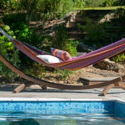 Wer das Gefühl der Schwerelosigkeit mag und gerne träumt, wird die Doppel Hängematte ‚Modesta‘ lieben. Sie besteht aus bunter Bio-Baumwolle, die lange Fasern hat und sehr reißfest ist. Mit den großzügigen Maßen 350 x 160 cm ist die Hängematte ideal für zwei Personen. Die maximale Belastbarkeit beträgt 160 kg.