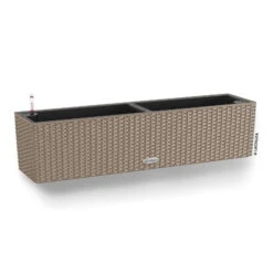 Dieser Balkonkasten aus robustem Kunststoff in trendiger Flechtoptik und elegantem Sandbraun wertet Ihr Begrünungskonzept für den Balkon oder das Wohnzimmer dekorativ auf. Dank eines integrierten Bewässerungssystems lässt der Blumenkasten ‚Balconera Cottage 80‘ von Lechuza Wohlfühlbedingungen für Ihre Pflanzen entstehen.