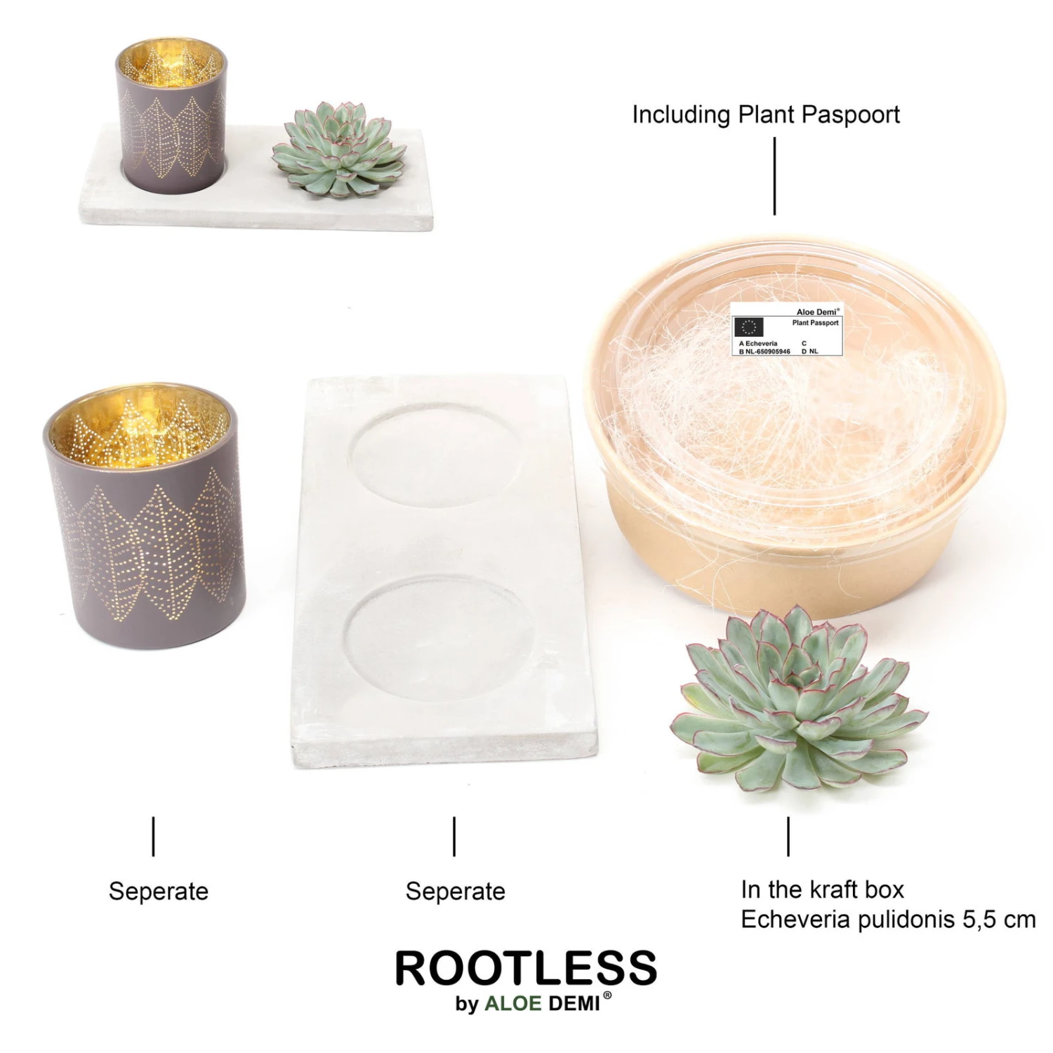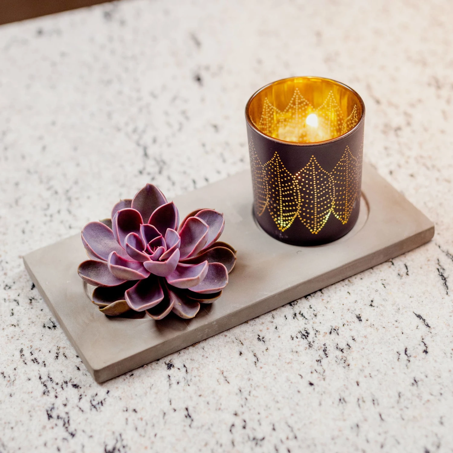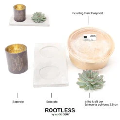 Dann sind Sie bei diesem attraktiven Werkstück richtig: Das Arrangement besteht aus einem Dekotablett aus Beton, welches mit einer formschönen Schnittsukkulente (Echeveria pulidonis) und einem Windlicht mit goldener Innenseite und Blattmuster bestückt ist. Mit der exklusiven Optik verschönert das Werkstück jeden Innenraum und setzt edle Akzente, egal ob auf der Fensterbank, dem Tisch oder als Hingucker im Eingangsbereich. Die Schnittsukkulente benötigt keinerlei Pflege, muss nicht gegossen werden und besticht mit kräftigen Farben und langer Haltbarkeit.
