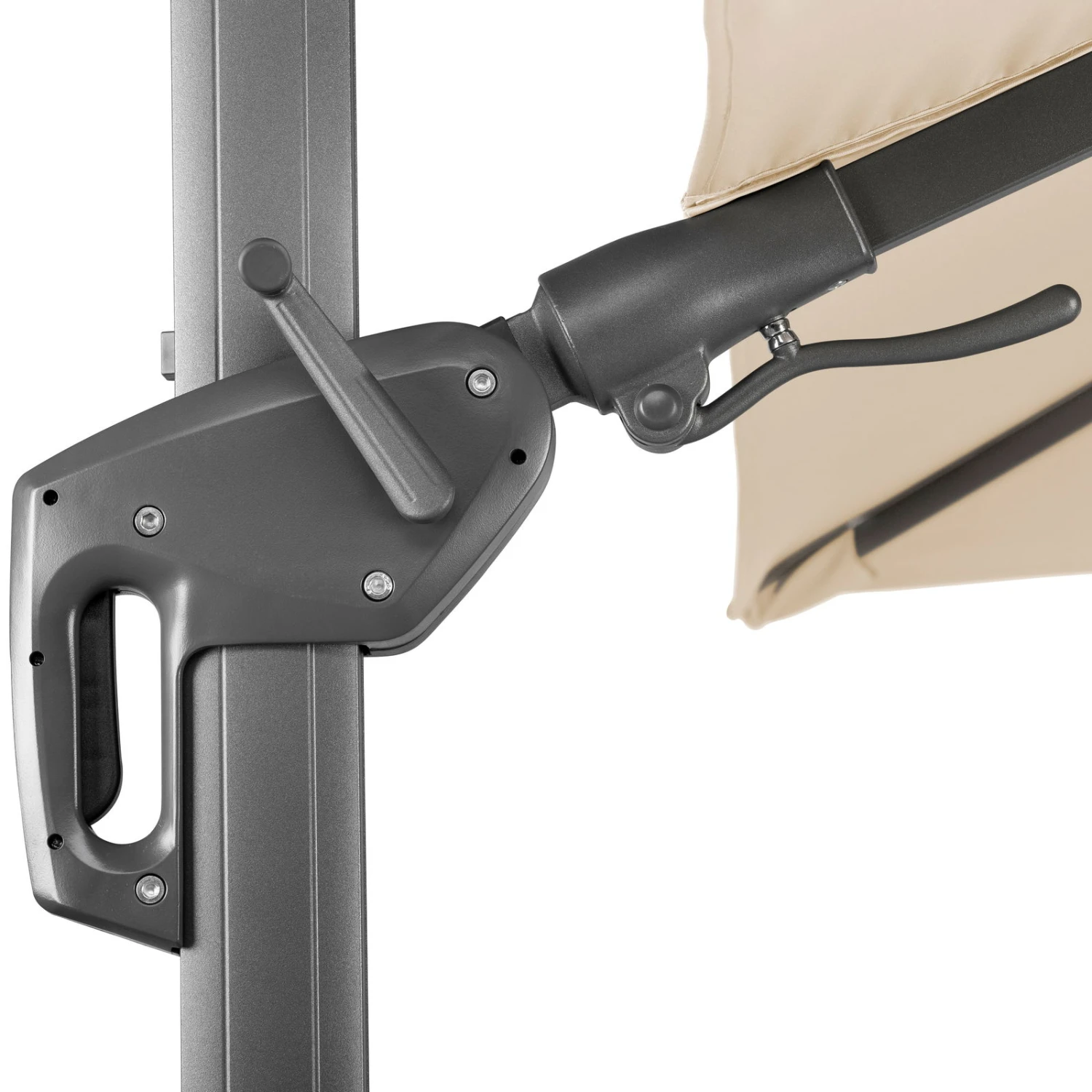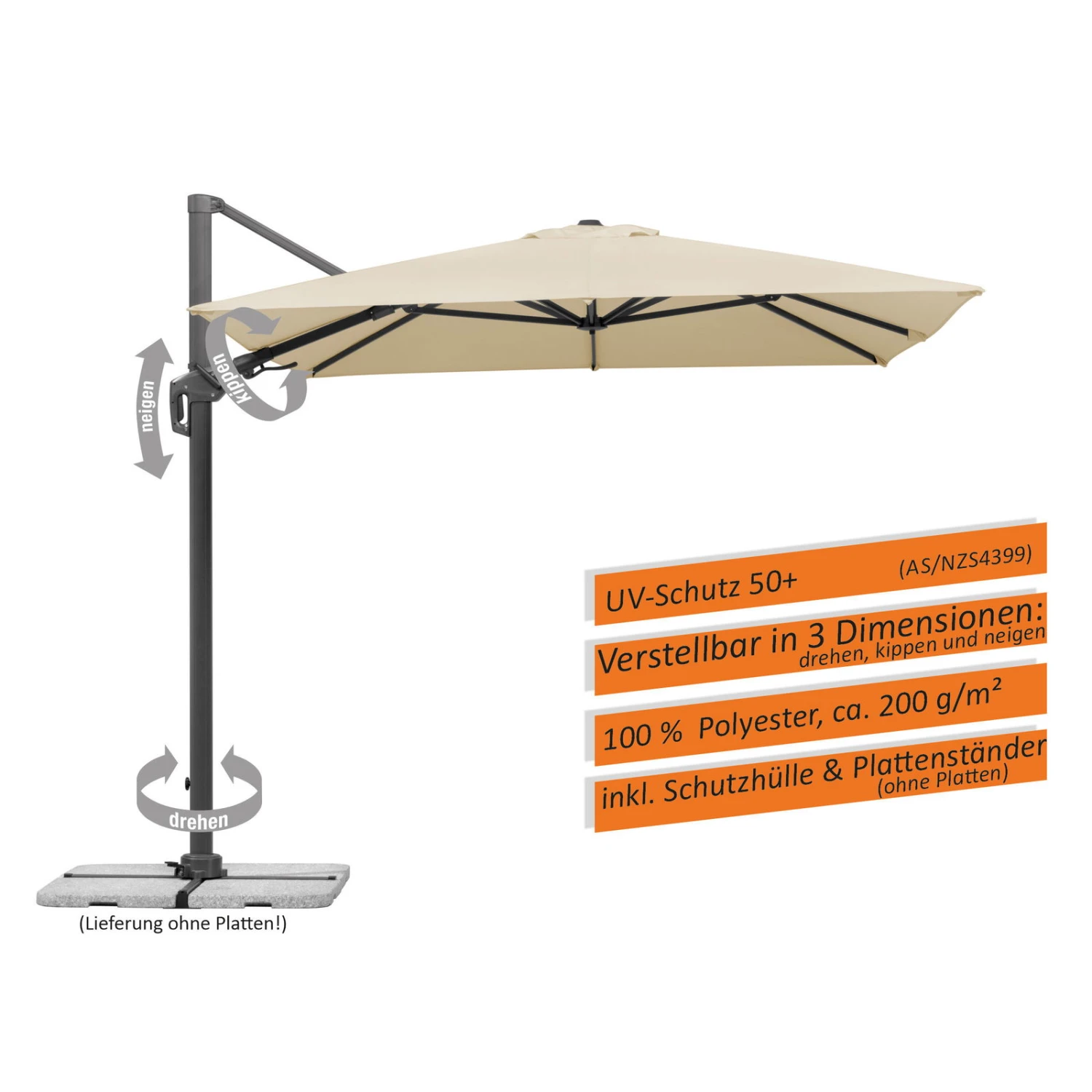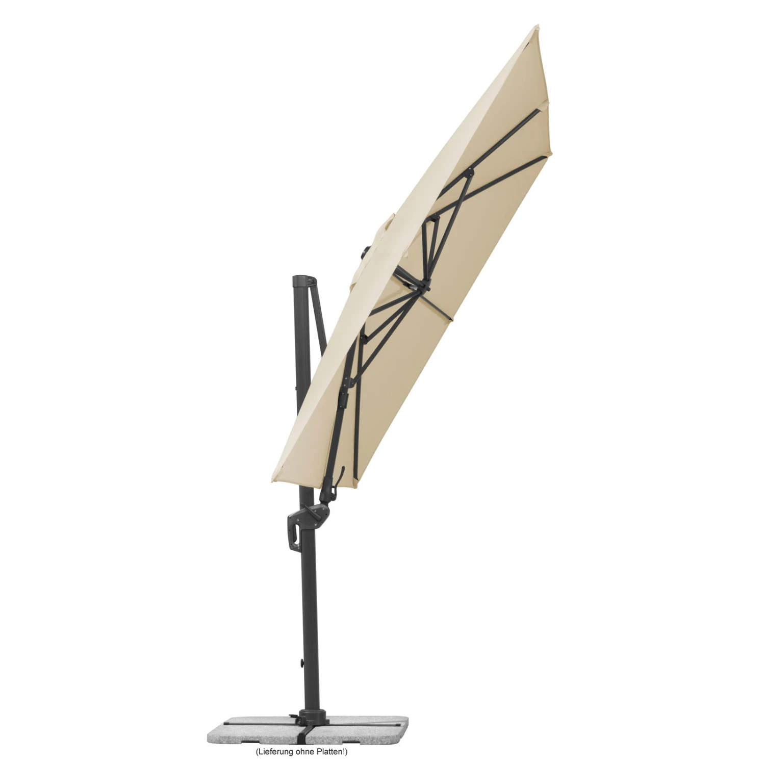 Wenn Sie nach einem großzügig dimensionieren und flexiblen Schattenspender suchen, dann ist der Sonnenschirm ‚Rhodos Twist‘ von Schneider-Schirme die richtige Wahl für Sie. Dieser Ampelschirm lässt sich mit wenigen Handgriffen in drei Dimensionen verstellen, sodass Sie zu jeder Tageszeit optimal von der Sonne geschützt bleiben. Außerdem profitieren Sie von einem verrottungsfesten und wasserabweisenden Polyesterbezug.