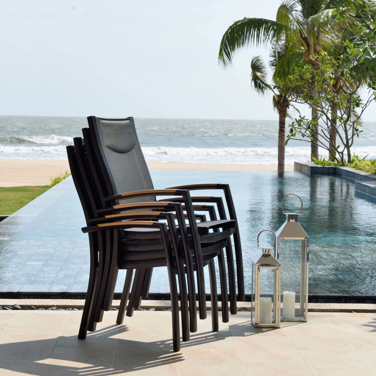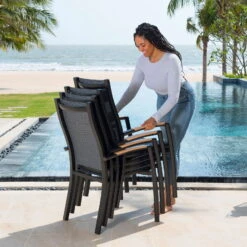 Genießen Sie mit dem Stapelsessel ‚Panama‘ maximalen Komfort im Außenbereich und werten Sie Ihre Dining-Landschaft auf eine stilvolle Art auf. Dieser schwarze Stapelsessel ist dank seines Alu-Gestells ein mobiles Leichtgewicht und überzeugt zugleich mit hoher Stabilität in Kombination mit maximalem Sitzkomfort. Nach dem Saisonende stapeln Sie den Sessel ‚Panama‘ auf Ihrer Terrasse oder im Schuppen platzsparend auf.