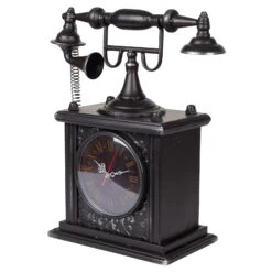 Diese Uhr im Telefondesign ist etwas ganz Besonderes und ein origineller Hingucker für jeden Raum. Das Ziffernblatt schmücken nostalgisch anmutende römische Zahlen. Die kunstvoll gestalteten, leicht verspielten Zeiger lassen dieses ungewöhnliche Wohnaccessoire apart aussehen. Die Telefon-Uhr in der Farbe schwarz ist aus Metall hergestellt und passt hervorragend zur Einrichtung im Shabby-Chic-Style oder zu Wohnkonzepten mit urbanem Flair. Mit der stilvollen und funktionellen Deko werten Sie Ihr Sideboard oder Ihre Wohnwand auf. Die Uhr lässt sich im Wohn- oder Schlafzimmer genauso erfolgreich wie in einer Diele in Szene setzen. Beachten Sie, dass die Uhr sich ausschließlich für die Verwendung im Indoorbereich eignet. Nehmen Sie zum Abstauben ein leicht angefeuchtetes, weiches Putztuch.